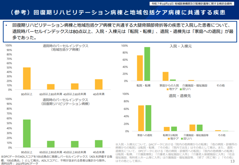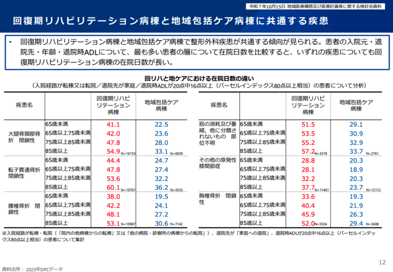 資料によれば、大腿骨頚部骨折(閉鎖性)で入院経路が転棟・転院、退院先が家庭、退院時ADLがバーセルインデックス80点以上相当の患者について、回復期リハビリテーション病棟の在院日数は地域包括ケア病棟より明らかに長い傾向が示されています。75歳以上85歳未満では回復期リハ病棟47.8日に対し、地域包括ケア病棟28.0日という差があります。