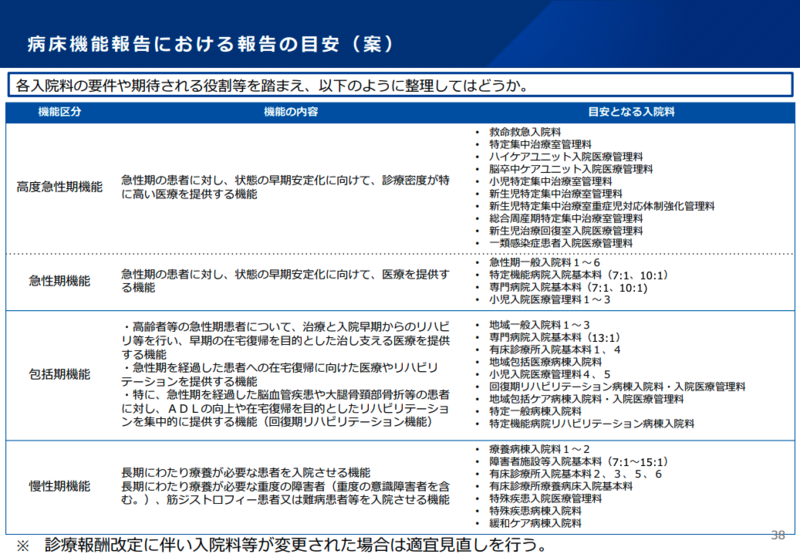 病床機能報告の客観性を高めるため、入院料と病床機能区分の対応関係を示す「目安」が提示されました。