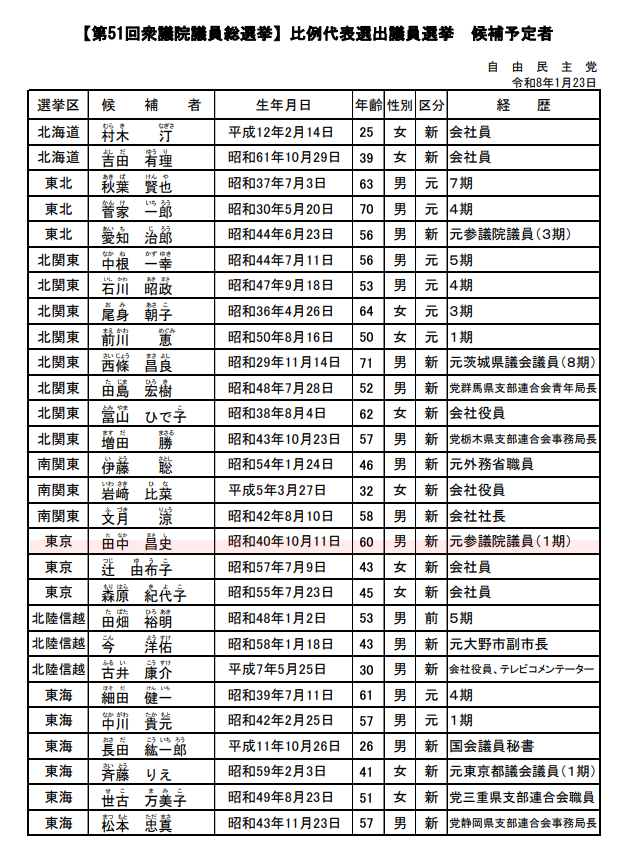 今回の公認発表(1月23日時点)によれば、自民党は比例代表で計52名の公認を決定しています。田中氏は「元職」の区分で名を連ねており、今回の比例代表における元職候補14名のうちの一人となります。