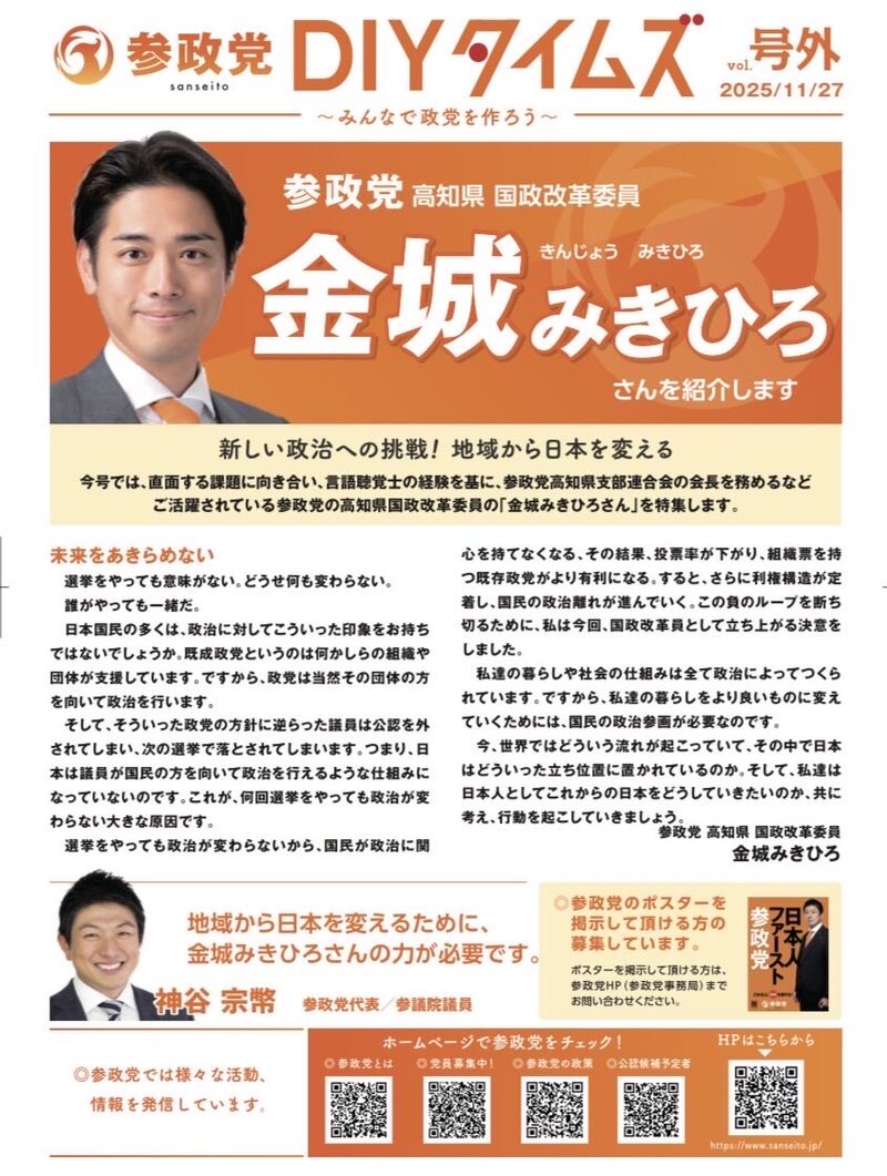 また、高知独特の宴会文化である「おきゃく・返杯」を引き合いに出し、身分や立場を超えて酒を酌み交わし、社会について語り合う対話の場を重視しています。金城氏は有権者に対し、メディアの情報だけでなく多角的に情報を得ること、そして家族や地域で「日本の未来」について語り合うことを強く求めています。