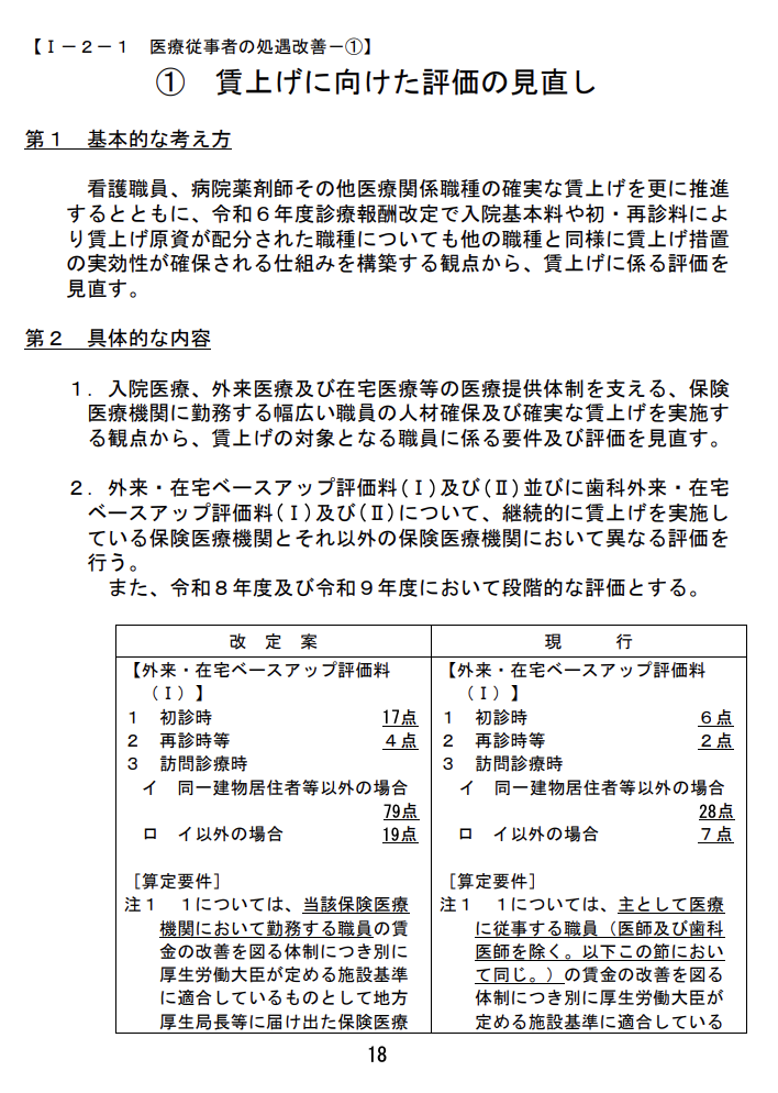 • 外来・在宅ベースアップ評価料(I):初診時17点(現行6点)、再診時6点(現行2点)、訪問診療時107点(現行28点)。