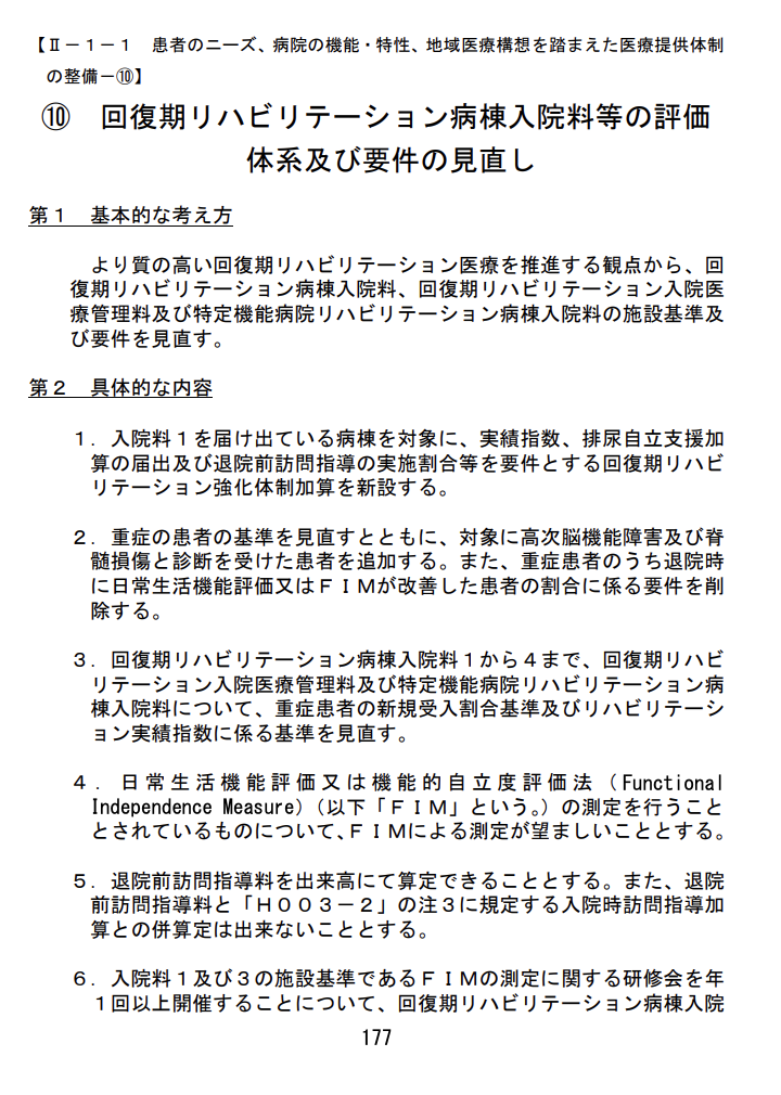 6. その他:退院前訪問指導の出来高算定化(入院時訪問指導加算との併算定不可)、FIM研修の必須化(入院料1〜4)、地域支援事業への参加(入院料1〜4で望ましい)、口腔管理体制整備(入院料3・4で望ましい)。