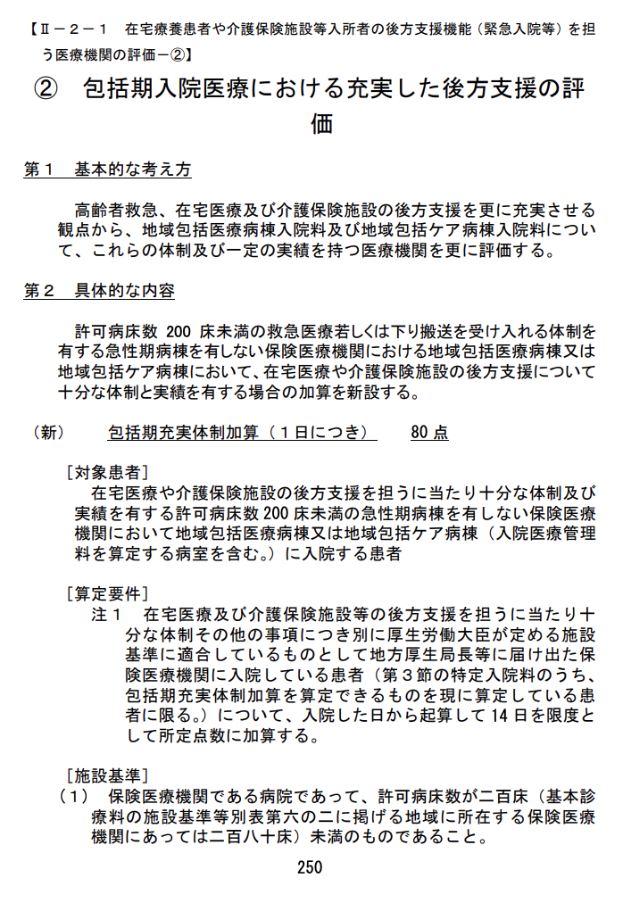 ●② 包括期充実体制加算(新設) 地域包括医療病棟・地域包括ケア病棟(200床未満・急性期病棟なし)における救急・在宅・介護施設からの受入実績を評価。