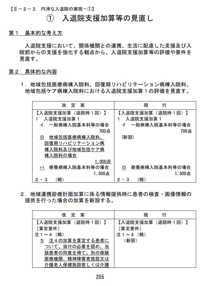 ●① 入退院支援加算1の評価見直し(メリハリ強化) 入退院支援加算1の点数が、病棟機能に応じて以下のように設定されました。特に回復期・地域包括ケア等は一般病棟より高く評価されます。