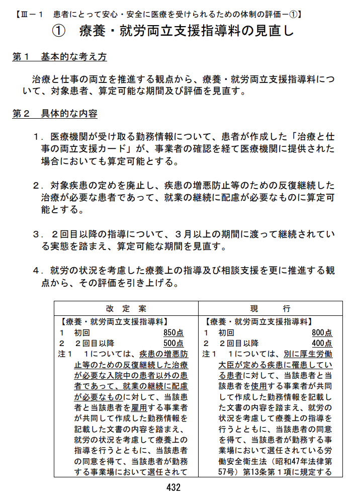 ●① 療養・就労両立支援指導料:対象疾患の廃止、評価引き上げ等。