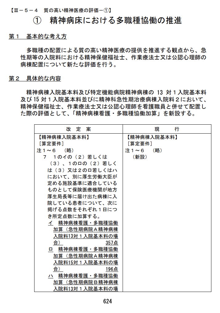 ●① 精神病棟看護・多職種協働加算(新設) 精神病棟(13対1・15対1等)において、精神保健福祉士、OT、公認心理師等を配置した場合の評価を新設。